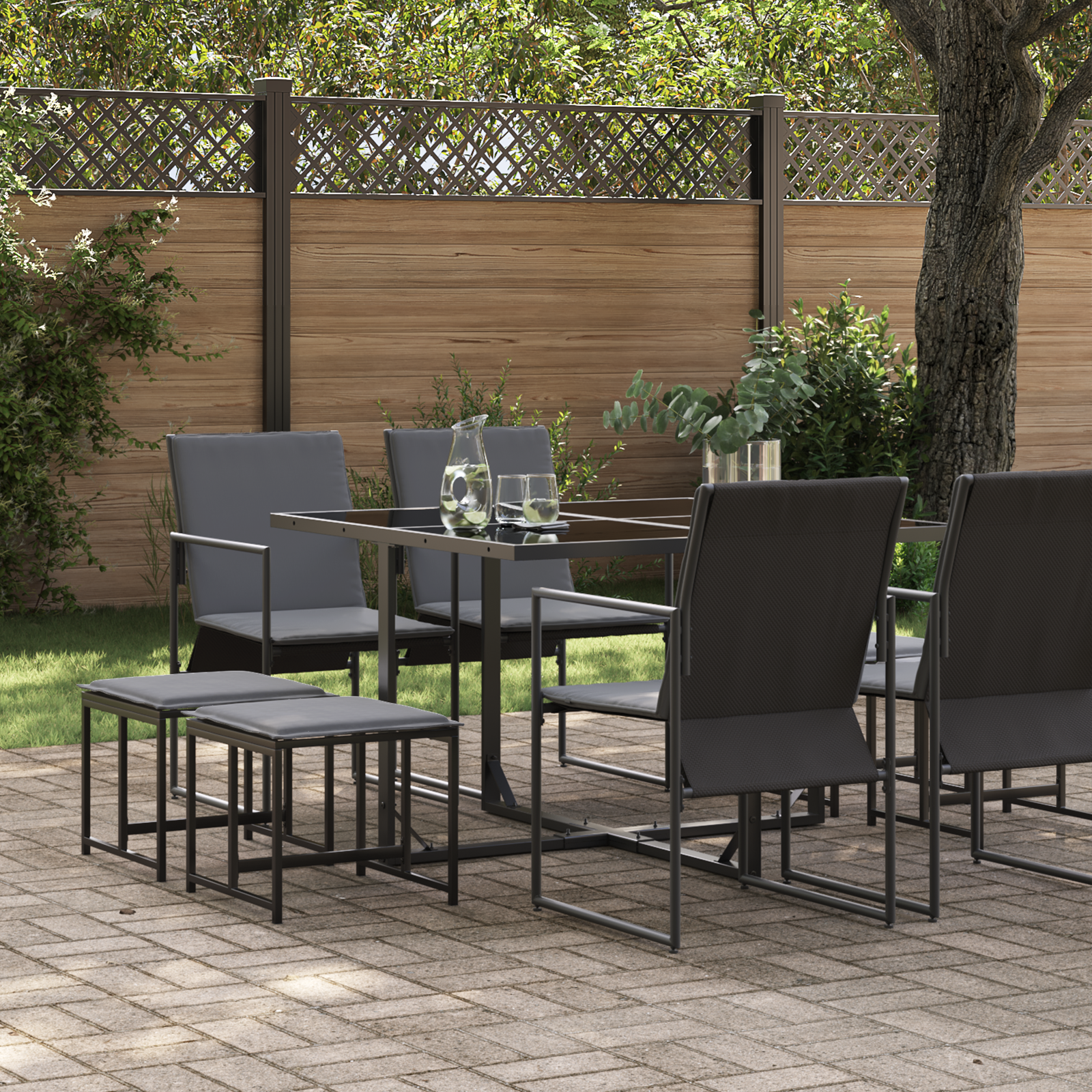 Sættet består af et rummeligt havebord, fire komfortable havestole og fire praktiske havepuffer, der alle er designet til at modstå de danske vejrforhold året rundt. Den sorte pulverlakerede stålkonstruktion sikrer exceptionel holdbarhed og rustbeskyttelse, mens de mørke grå textilene puder tilføjer både stil og komfort til dine udendørs områder.