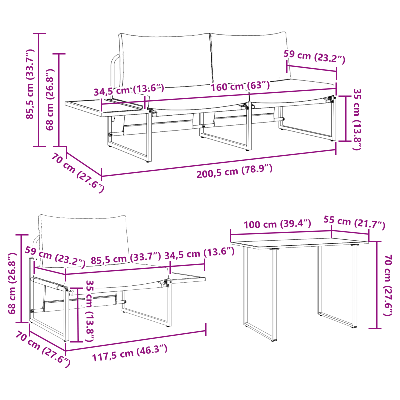 Med plads til tre personer er dette terrassemøbelsæt ideelt til intime middage under åben himmel, afslappende eftermiddage med kaffe og kage eller hyggelige aftener med venner. Det rektangulære bord giver rigelig plads til servering, mens sofaen og stolen tilbyder forskellige siddemuligheder for maksimal fleksibilitet.