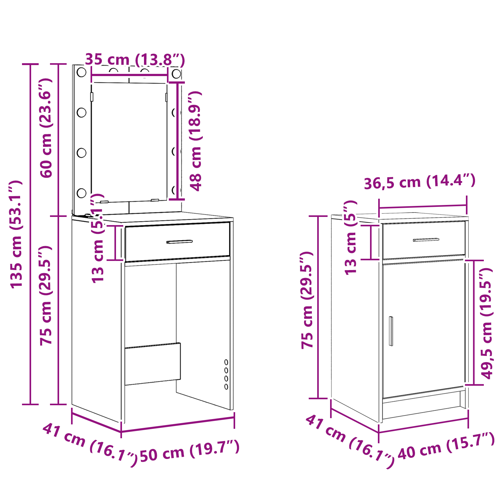 Sættet inkluderer alt, hvad du behøver: et elegant toiletbord med to døre, tre praktiske opbevaringsskuffer og et stort, funktionelt spejl. De kolde hvide LED-lys skaber den ideelle belysning til makeup og styling, mens den samlede højde på 135 cm gør bordet behageligt at bruge.