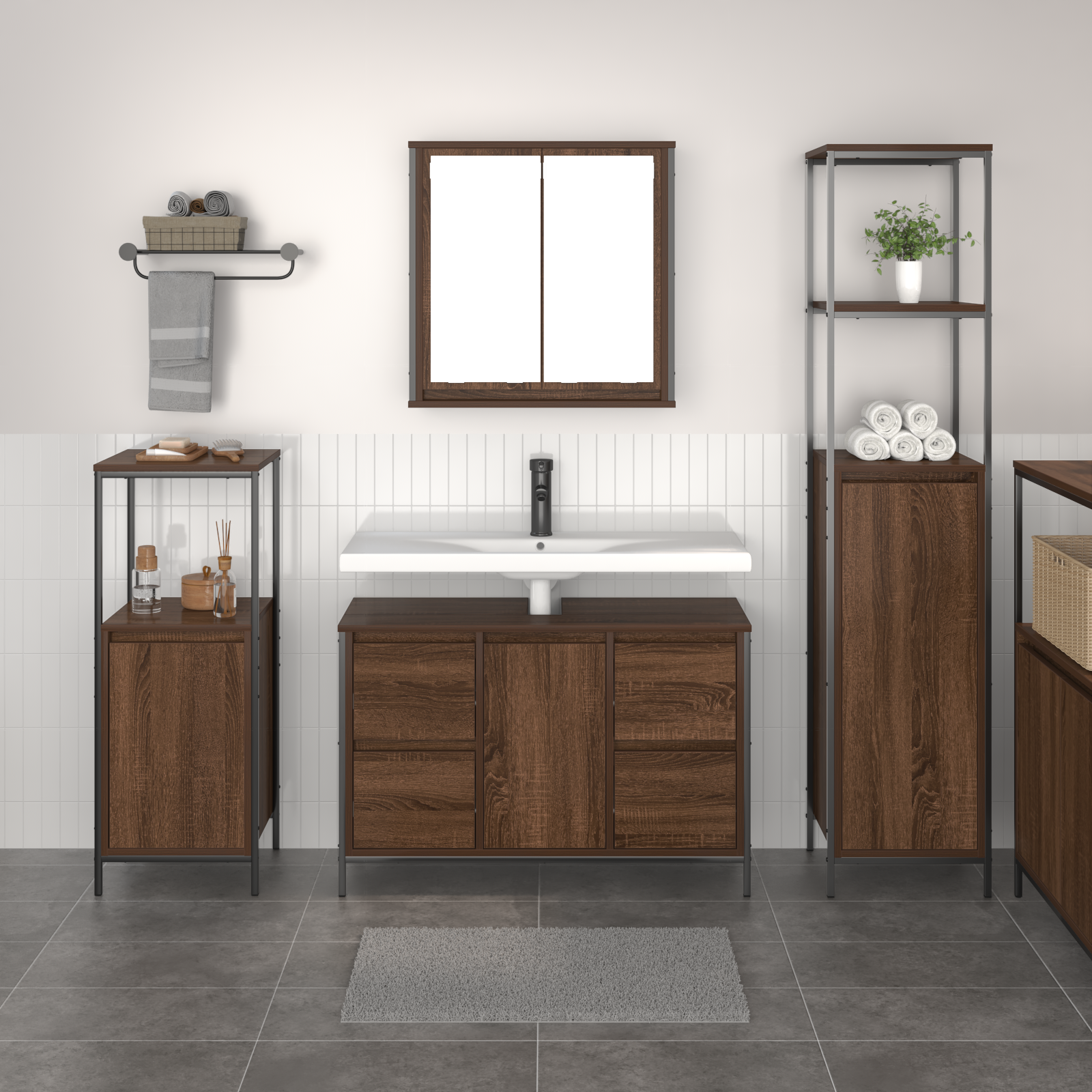 Den varme brune egetræsfinish i mat overflade tilføjer naturlig elegance til rummet og passer perfekt ind i både moderne og klassiske badeværelser. Det tidløse design gør, at møblerne nemt kan kombineres med eksisterende indretning og tilbehør. Fremstillet i højkvalitets konstrueret træ med solide metaldetaljer, garanterer dette møbelsæt lang holdbarhed og stabilitet i det fugtige badeværelsesmiljø.