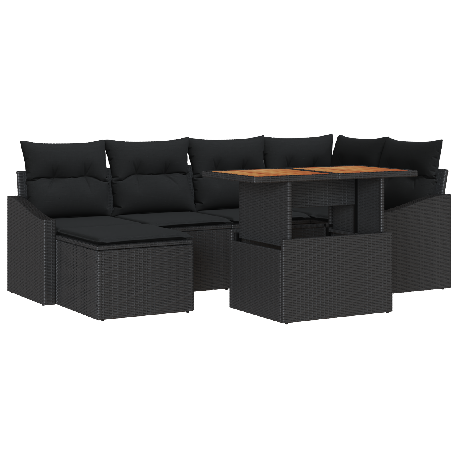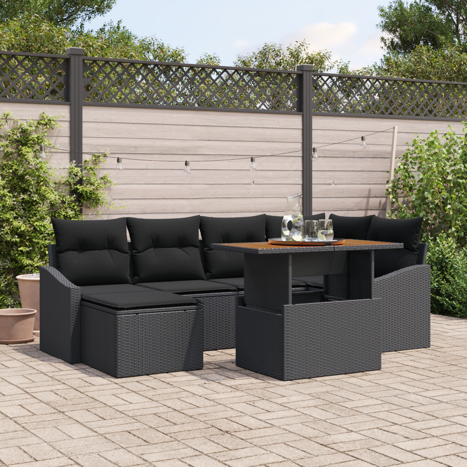 Den stilfulde sorte poly rattan giver ikke kun dit udendørsområde en moderne og tidløs atmosfære, men er også UV-resistent, så møblerne bevarer deres flotte udseende gennem mange sæsoner. Kombineret med det solide akacietræsbord får du både holdbarhed og naturlig skønhed i ét sæt.