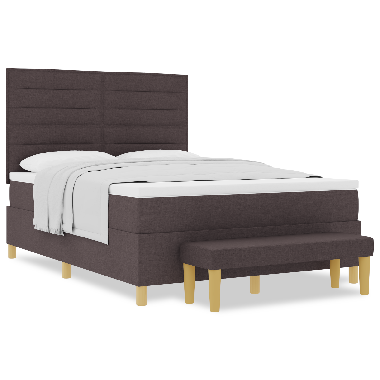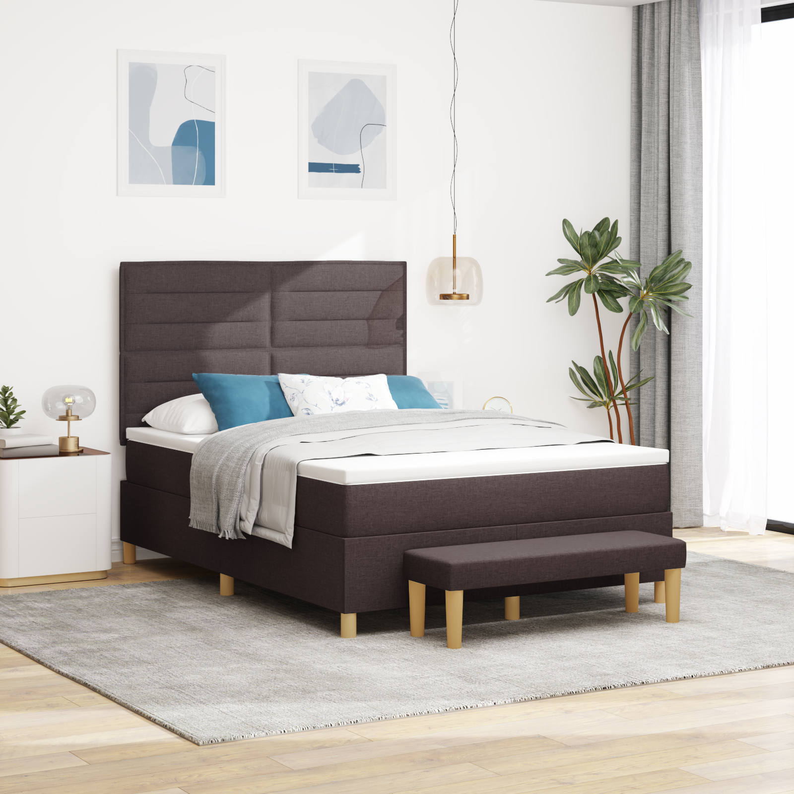 Denne elegante box spring seng i mørkebrun stof er den perfekte løsning for dit soveværelse, hvis du ønsker komfort og stil i ét samlet møbel. Med sine 140x190 cm dimensioner passer den ideelt til en dobbelmadras og giver plads til to personer.
