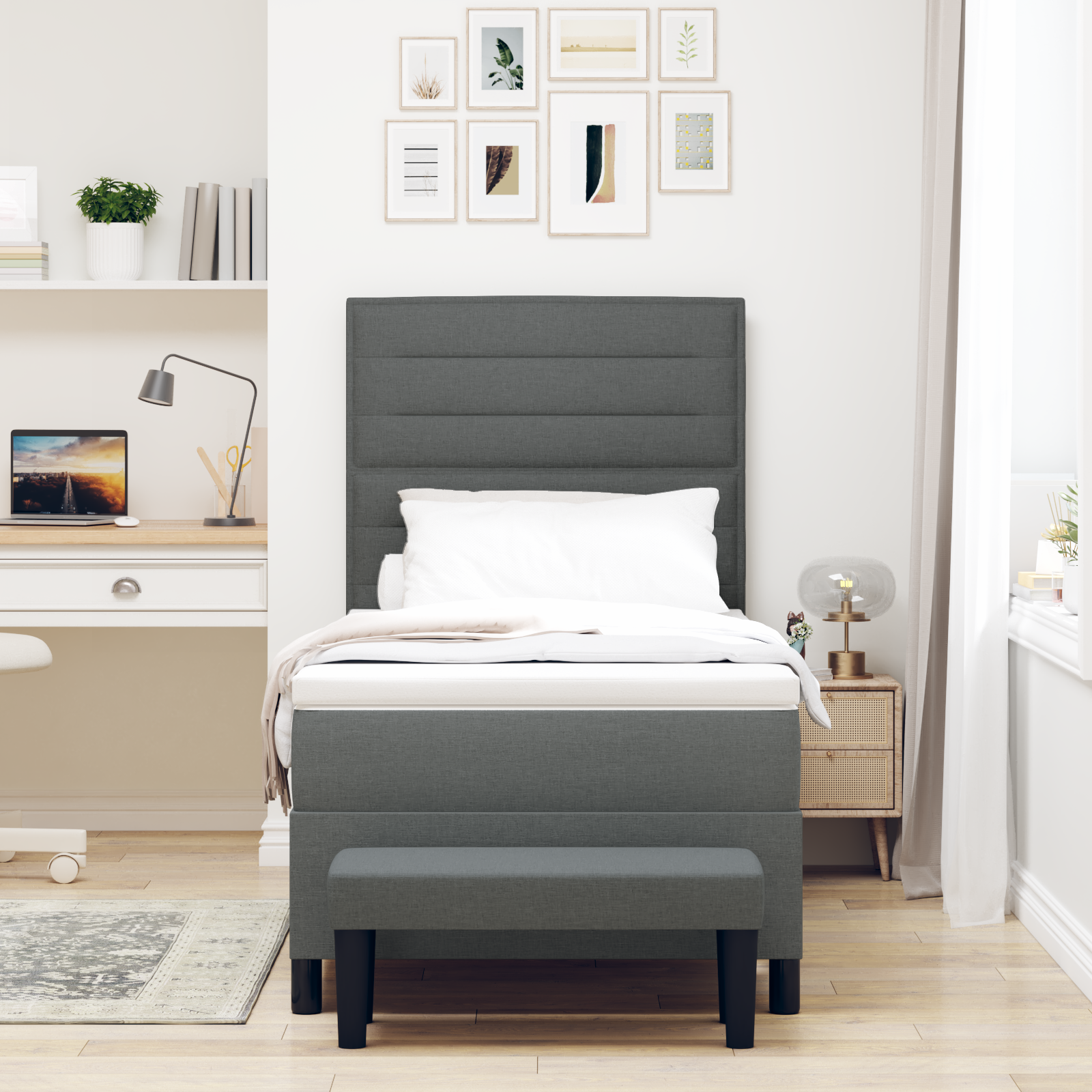 Det smukke mørkegrå stofbetræk med solide træben skaber en moderne og tidløs atmosfære, der nemt tilpasser sig forskellige indretningsstile. Sengen leveres som et komplet sæt med kvalitetsmadras, lækker topper og en praktisk bænk, så du får alt hvad du behøver til en perfekt søvnoplevelse.