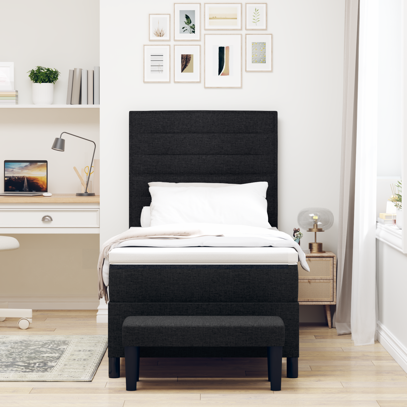 Denne elegante box spring seng kombinerer moderne design med exceptionel komfort og gør den til det perfekte valg for dit soveværelse. Med sit sofistikerede sorte stofbetræk og solide konstruktion leverer denne enkeltpersons seng både stil og funktionalitet.