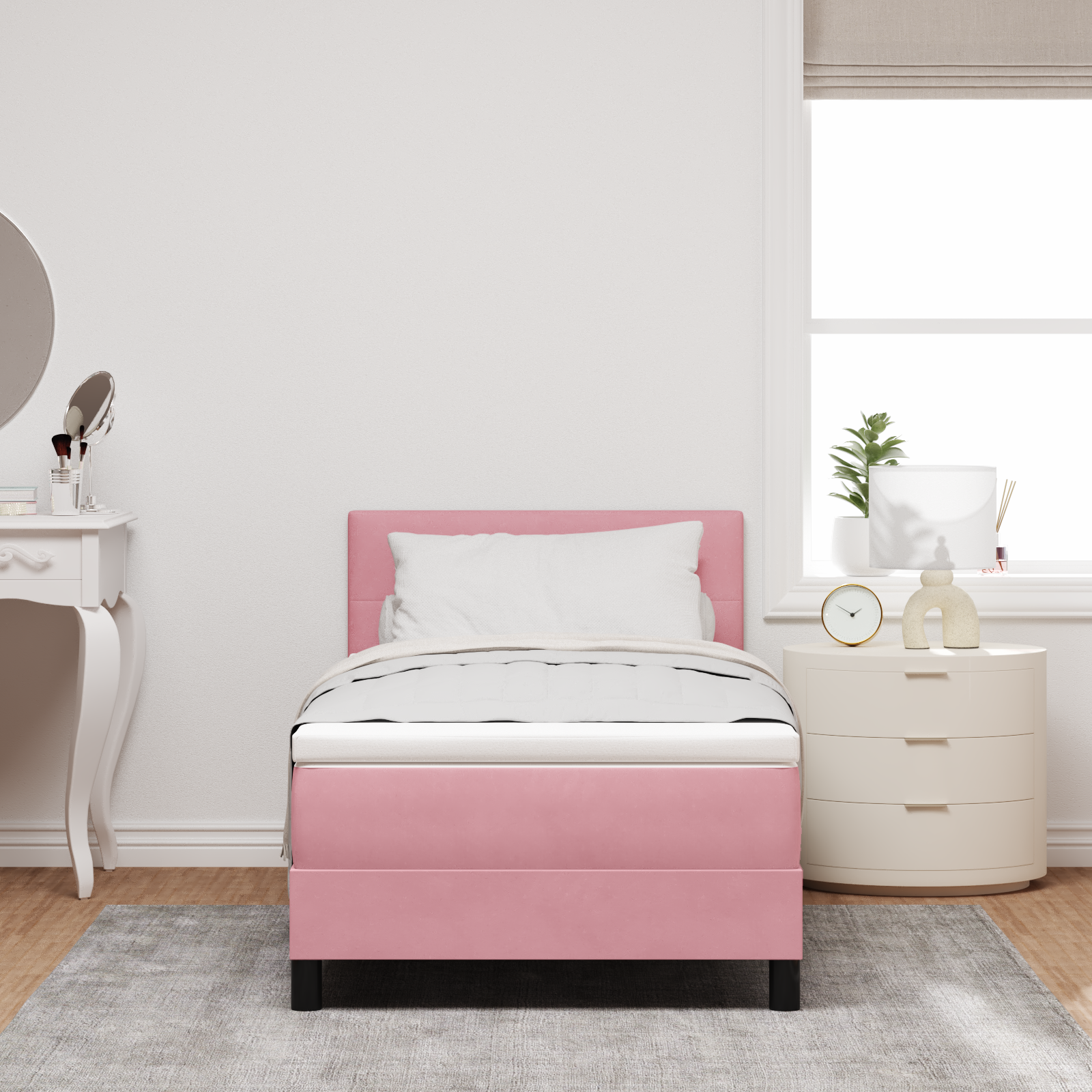 Forvandl dit soveværelse til en oase af komfort og stil med denne elegante box spring seng i pink fløjl. Den smukke rosa farve skaber en blød og indbydende atmosfære, mens det luksuriøse fløjlsstof tilføjer et eksklusivt touch til dit soveværelse.