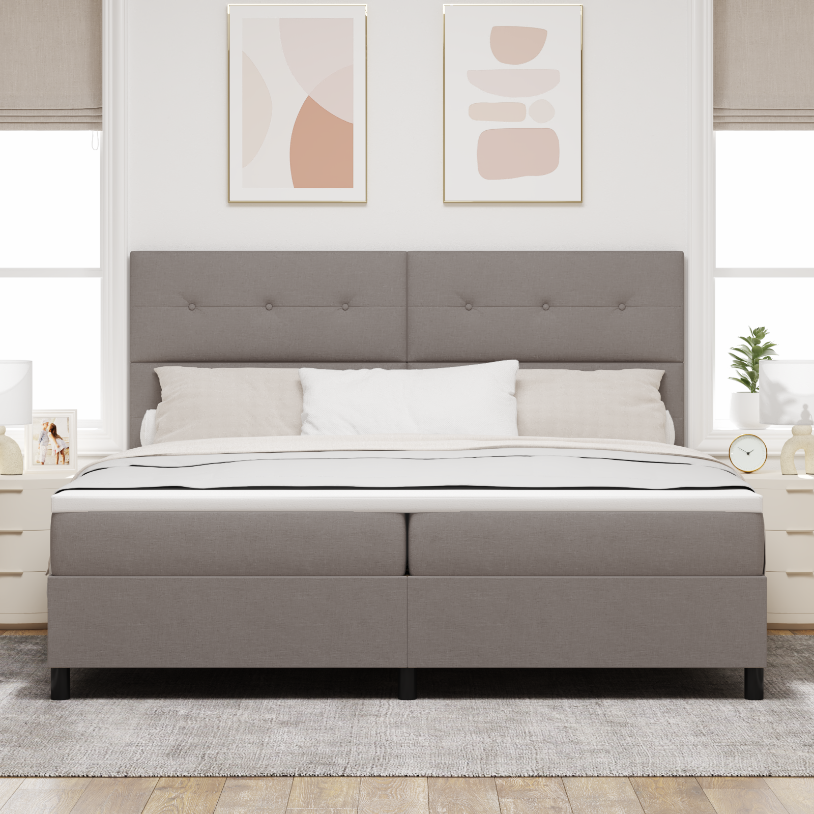 Denne stilfulde box spring seng i taupe stof kombinerer moderne design med overlegen komfort og er designet til at transformere dit soveværelse til et luksuriøst hvilested. Med sin elegante 200x200 cm størrelse tilbyder denne kontinentalseng rigelig plads til par, der ønsker optimal søvnkomfort og bevægelsesfrihed.