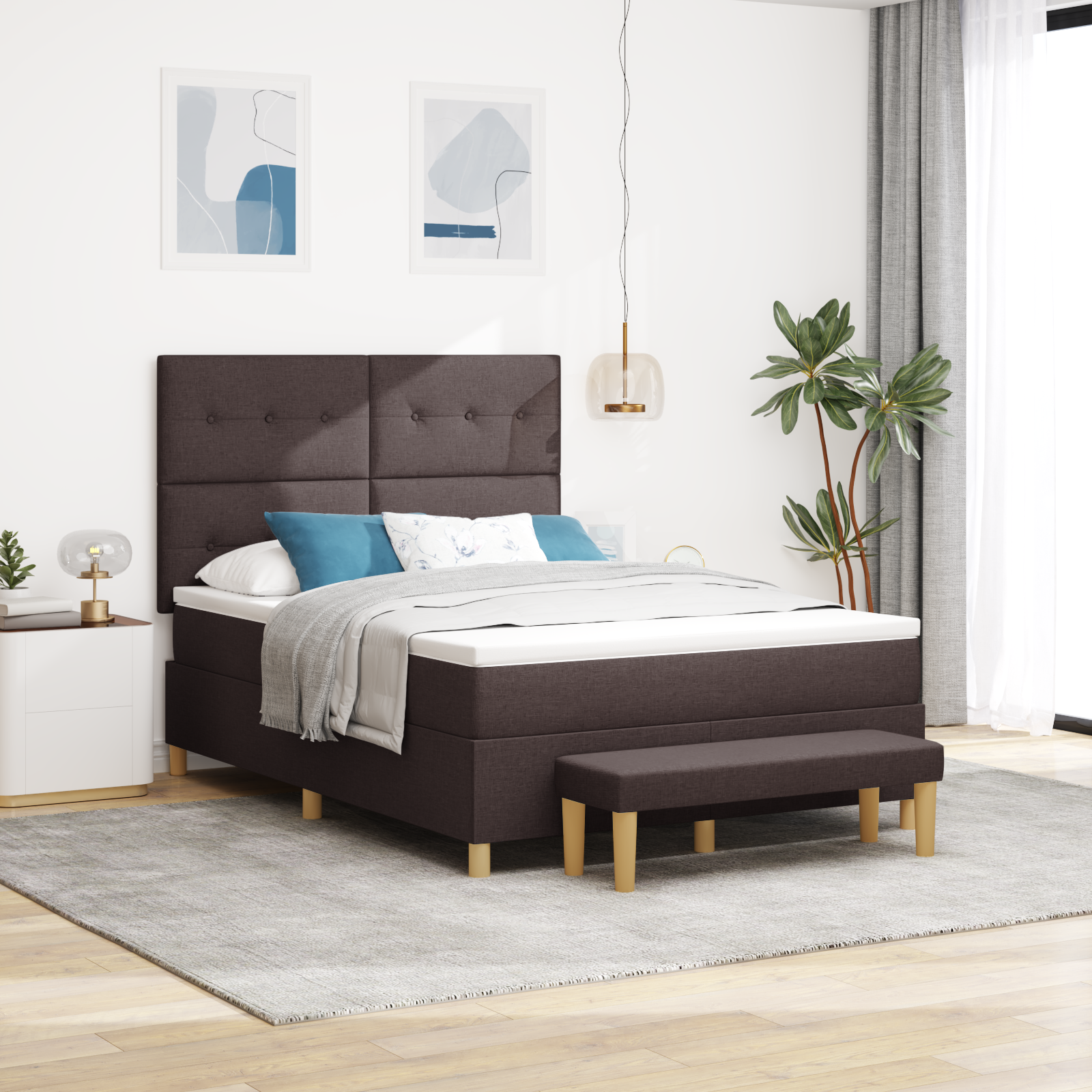Skab det perfekte soveværelse med denne elegante boxspring seng i mørkebrun, der kombinerer klassisk design med moderne funktionalitet. Den polstrede sengeramme med knap tufted finish giver dit soveværelse et luksuriøst og tidløst udtryk, der passer perfekt til både moderne og traditionelle indretningsstile.