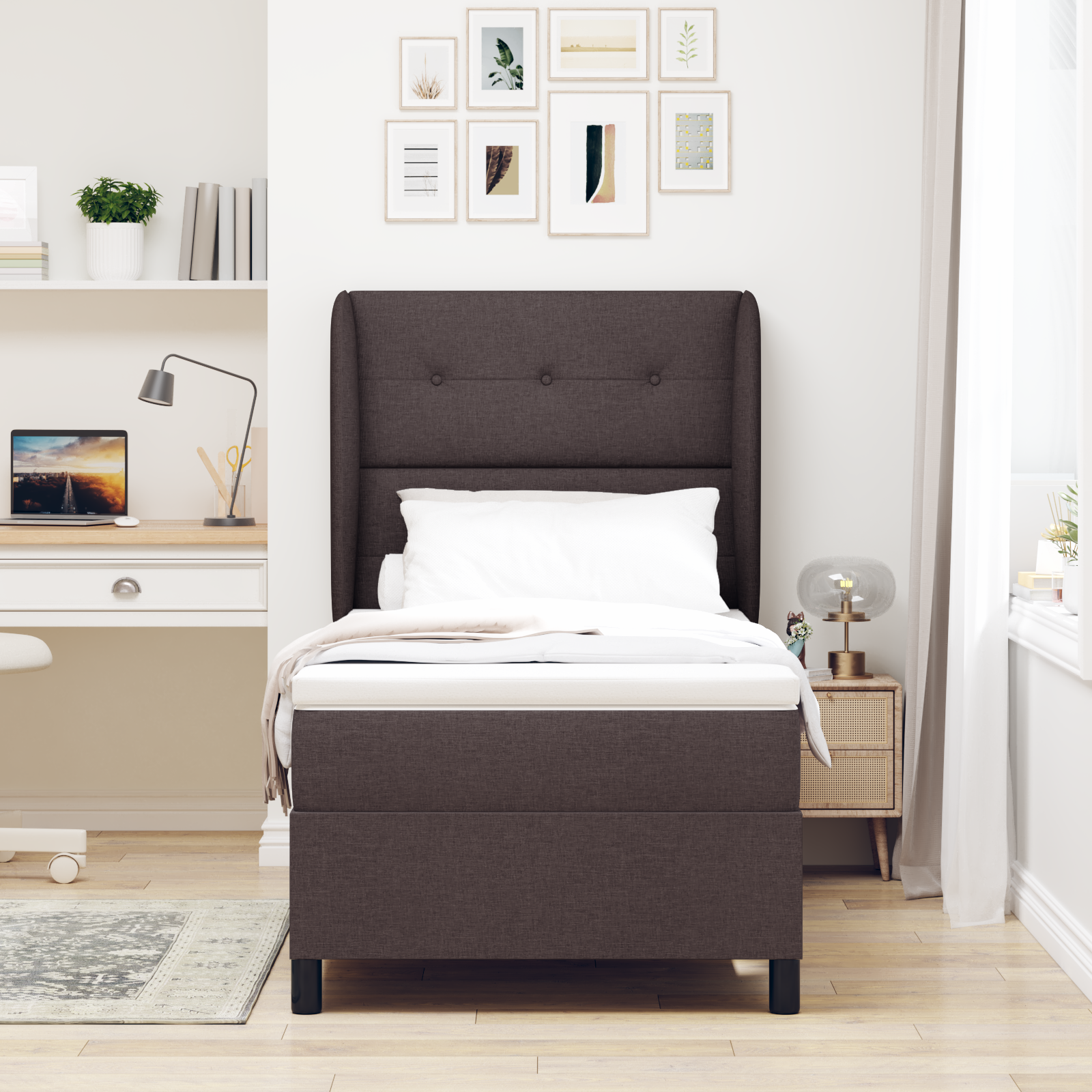 Denne elegante boxspring seng med madras i mørkebrun stof kombinerer stilfuldt design med optimal komfort for at give dig den perfekte nattesøvn. Med sine kompakte mål på 100x200 cm er denne enkeltseng ideel til mindre soveværelser, gæsteværelser eller ungdomsværelser, hvor pladsen er begrænset, men hvor komfort og kvalitet stadig prioriteres højt.