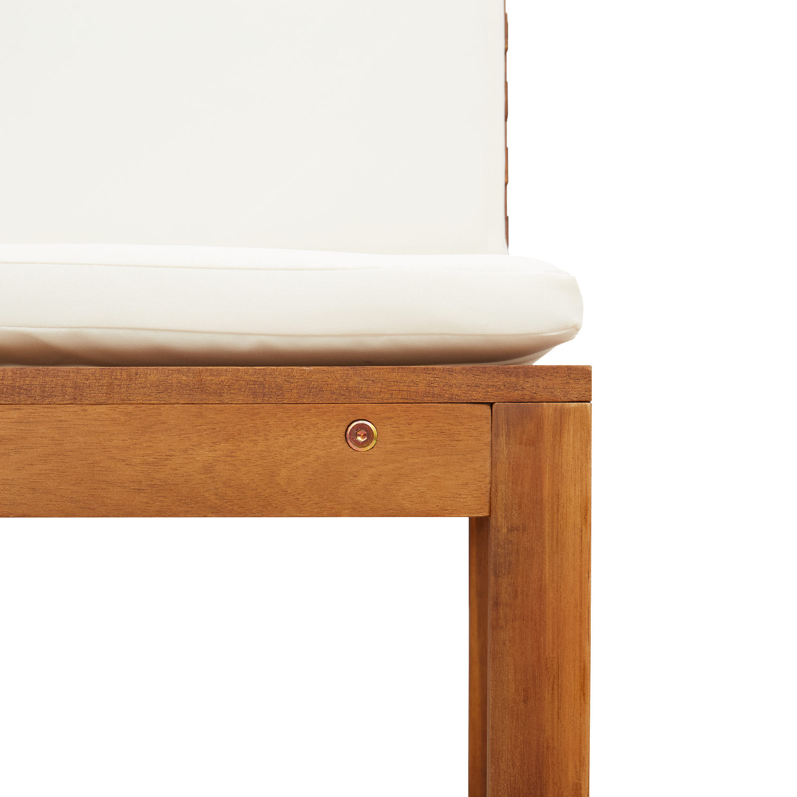 Stolene udmærker sig ved deres smukke cremehvide hynder, som tilføjer et lyst og moderne udtryk til dit udendørs område. Den polerede træoverflade fremhæver akacietræets naturlige årer og giver stolene en eksklusiv finish, der passer perfekt ind i både klassiske og moderne havemiljøer.