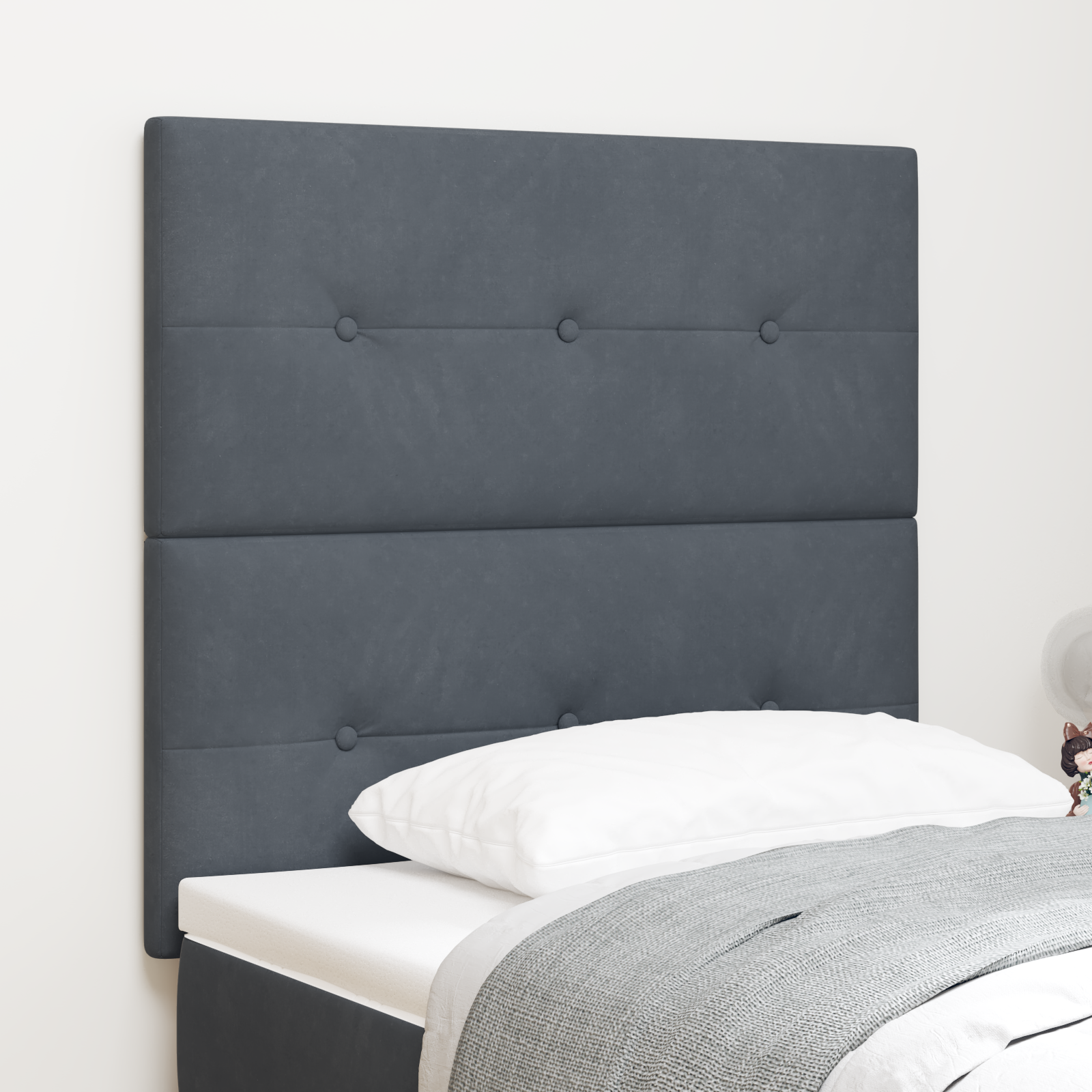 Forvandl dit soveværelse til en elegant oase med denne stilfulde hovedgærde i mørkegrå fløjl. Den knappede sengegavl kombinerer tidløs design med moderne komfort og skaber et luksuriøst udtryk, der løfter hele rummets atmosfære.