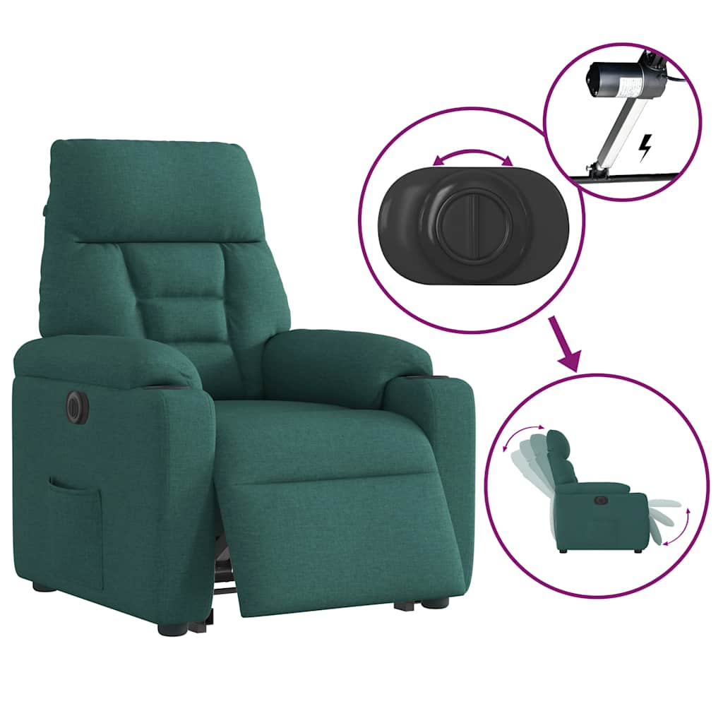 Det tykke polstrede sæde og ryglæn i slidstærkt polyesterstof giver en behagelig siddeoplevelse time efter time. Stoffet er åndbart og let at vedligeholde, mens den mørkegrønne farve tilføjer et elegant touch til din stue eller soveværelse. De brede armlæn giver ekstra støtte og komfort, mens de praktiske kopholdere og sidelommen holder dine drikkevarer, fjernbetjening og andre småting inden for rækkevidde.