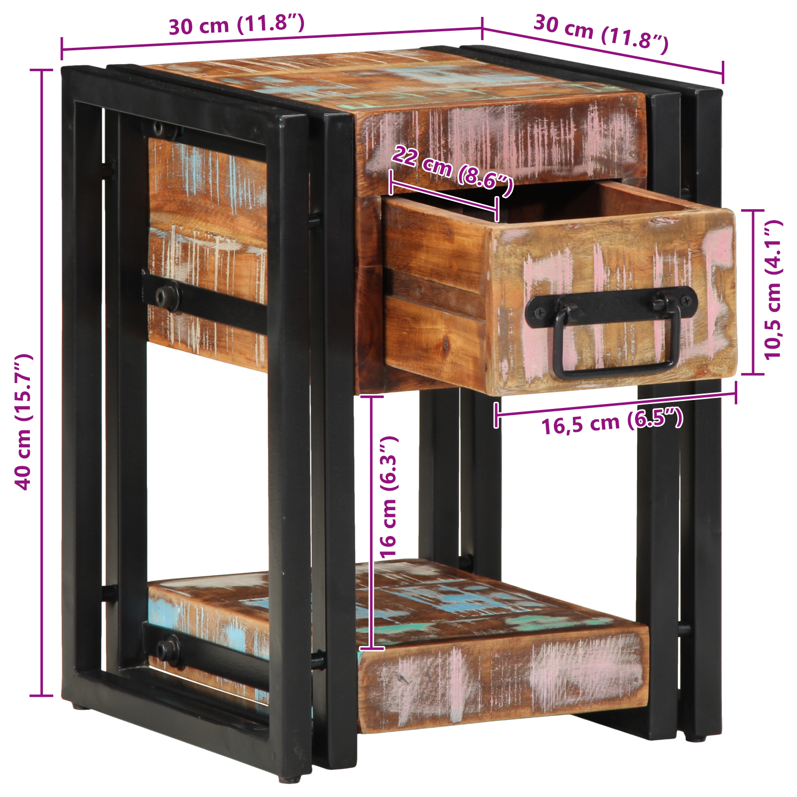 - Farve: Flerfarvet træoverflade med sort metalramme