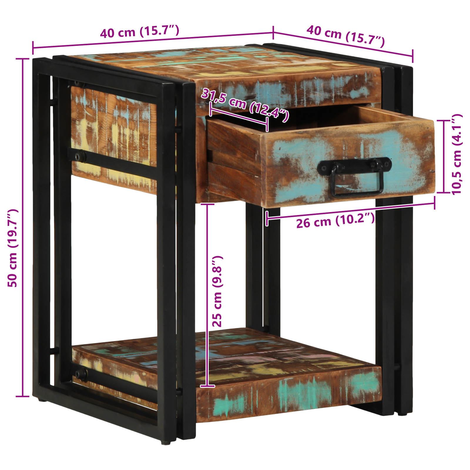 Sengebordet er fremstillet af massivt genbrugstræ, hvilket giver hvert møbel sin helt egen unikke karakter. De flerfarvede nuancer og den naturlige træstruktur tilfører varme og personlighed til dit soveværelse, mens den robuste jernramme sikrer stabilitet og holdbarhed i mange år fremover.