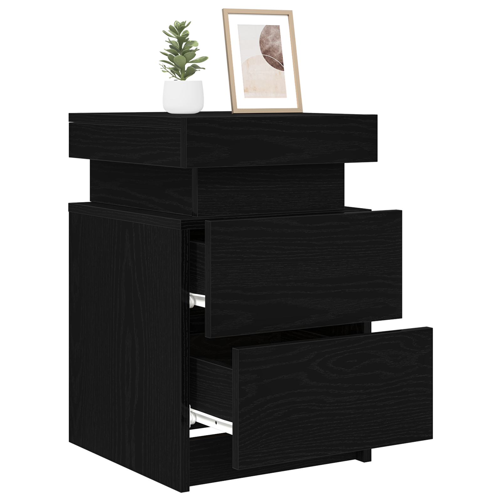 Opgradér dit soveværelse med dette moderne sengebord med LED-lys i sort egefinish. Det stilfulde natbord kombinerer funktionalitet med moderne design og skaber den perfekte balance mellem praktisk opbevaring og elegant udtryk i dit soverum.