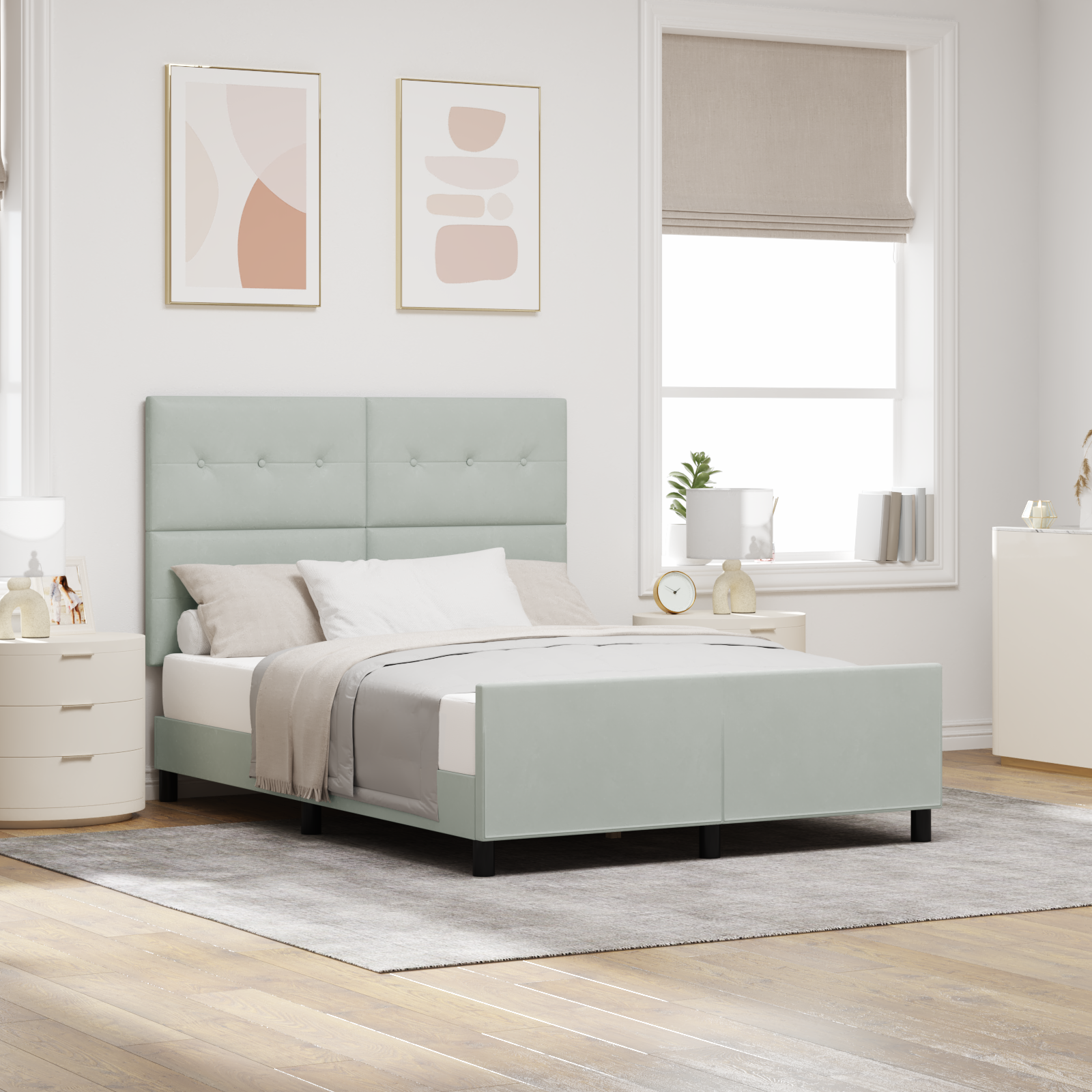 Den neutrale lysegrå farve gør det nemt at matche sengen med eksisterende sengetøj og soveværelsesindretning. Fløjlsstoffet tilføjer en luksuriøs følelse og skaber et indbydende rum, hvor afslapning og hvile står i centrum. Sengerammens rektangulære form og rene linjer sikrer, at den aldrig går af mode.
