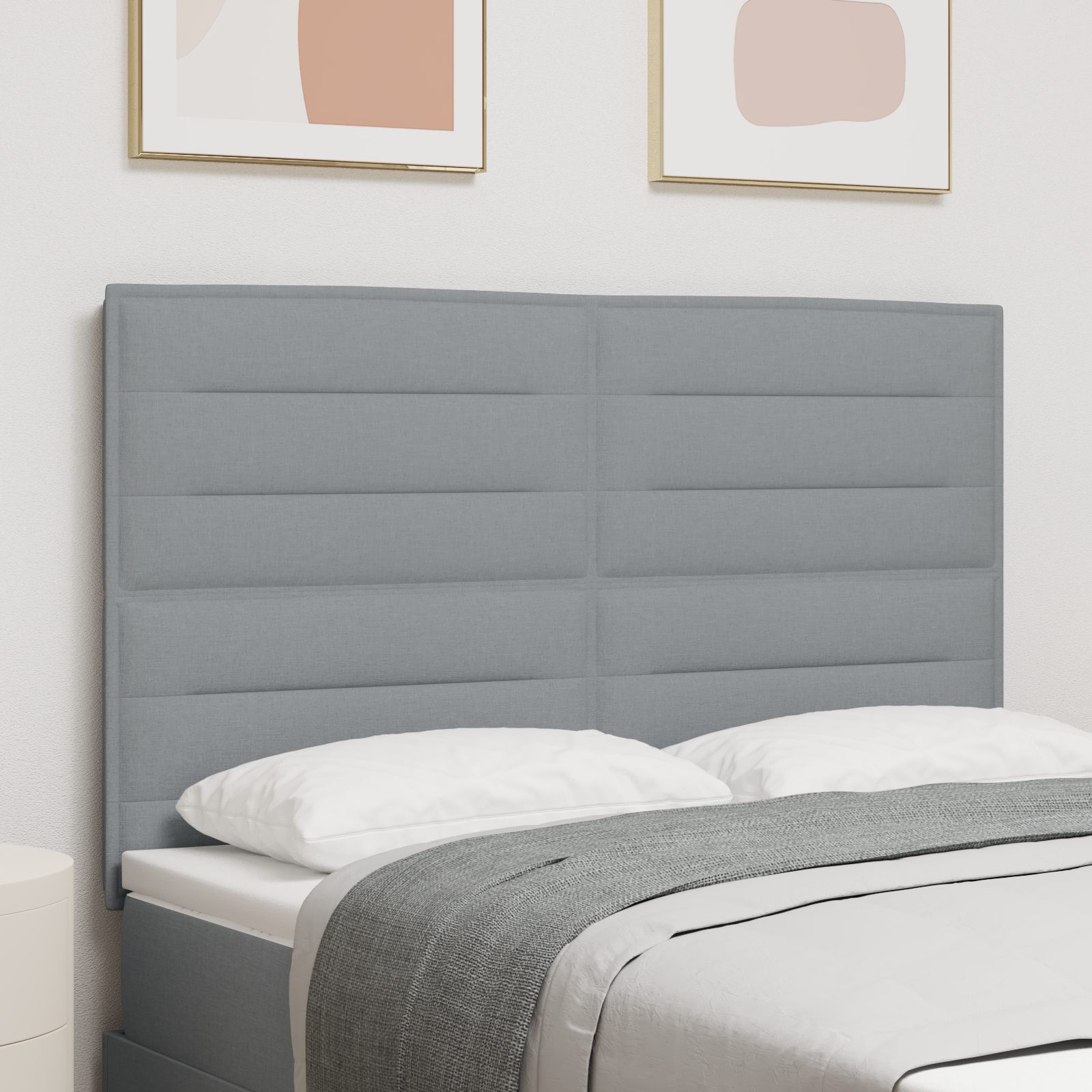 Opgrader dit soveværelse med denne elegant polstrede sengegavl, der kombinerer moderne linjedesign med praktisk funktionalitet. Den lyse grå stofoverflade skaber en harmonisk og stilfuld atmosfære, der fungerer som det perfekte fokuspunkt i dit soveværelse.