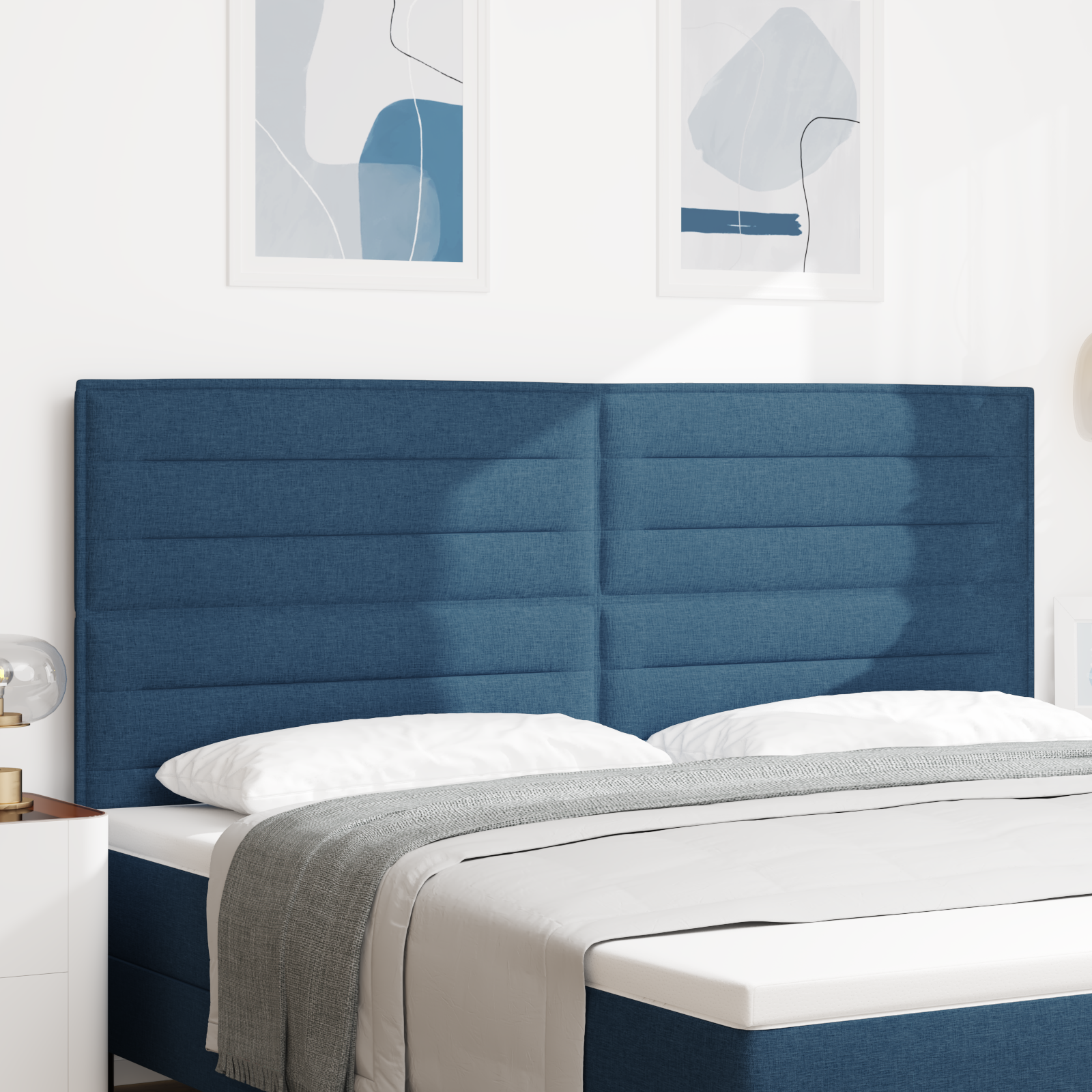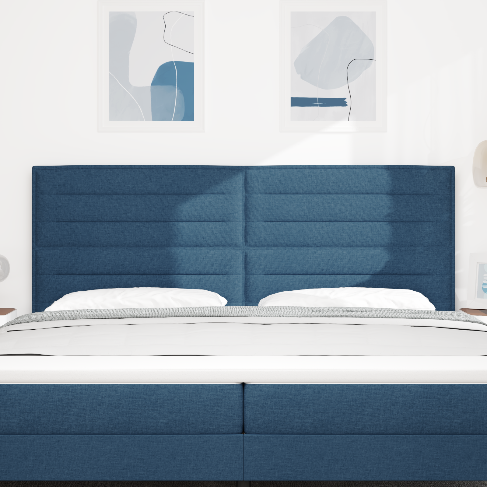 Denne polstrede sengegavl i blå stof kombinerer moderne linjedesign med praktisk funktionalitet og er det perfekte valg til ethvert soveværelse. Med sine slanke linjer og skarpe blå farve forvandler den dit rum og tilbyder både komfort og elegant stil.
