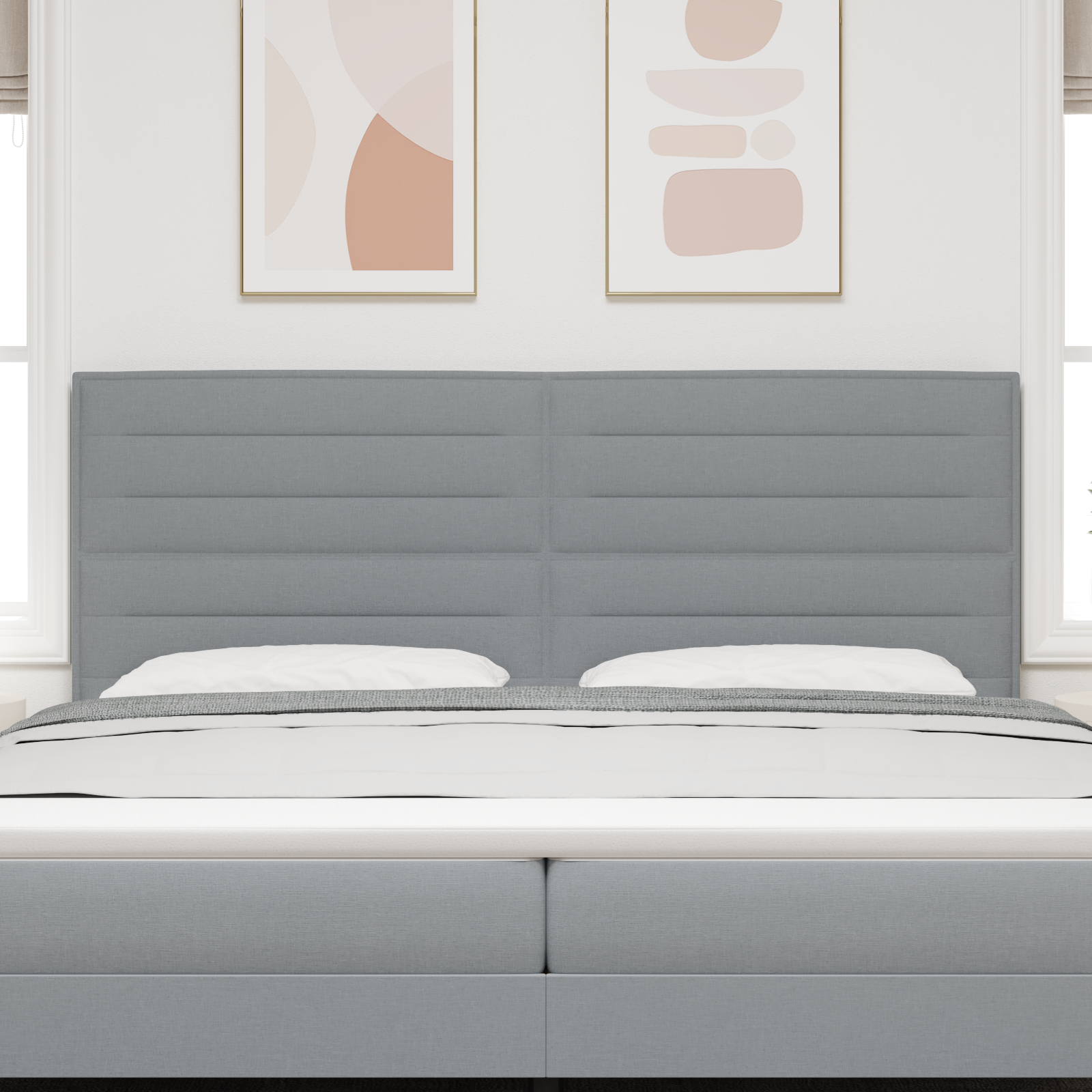 Transformer dit soveværelse med denne elegante polstrede sengegavl i lysegrå stof. Med sit moderne linjer design skaber den en stilfuld og samtidig funktionel løsning, der passer perfekt til både store og små soveværelser.