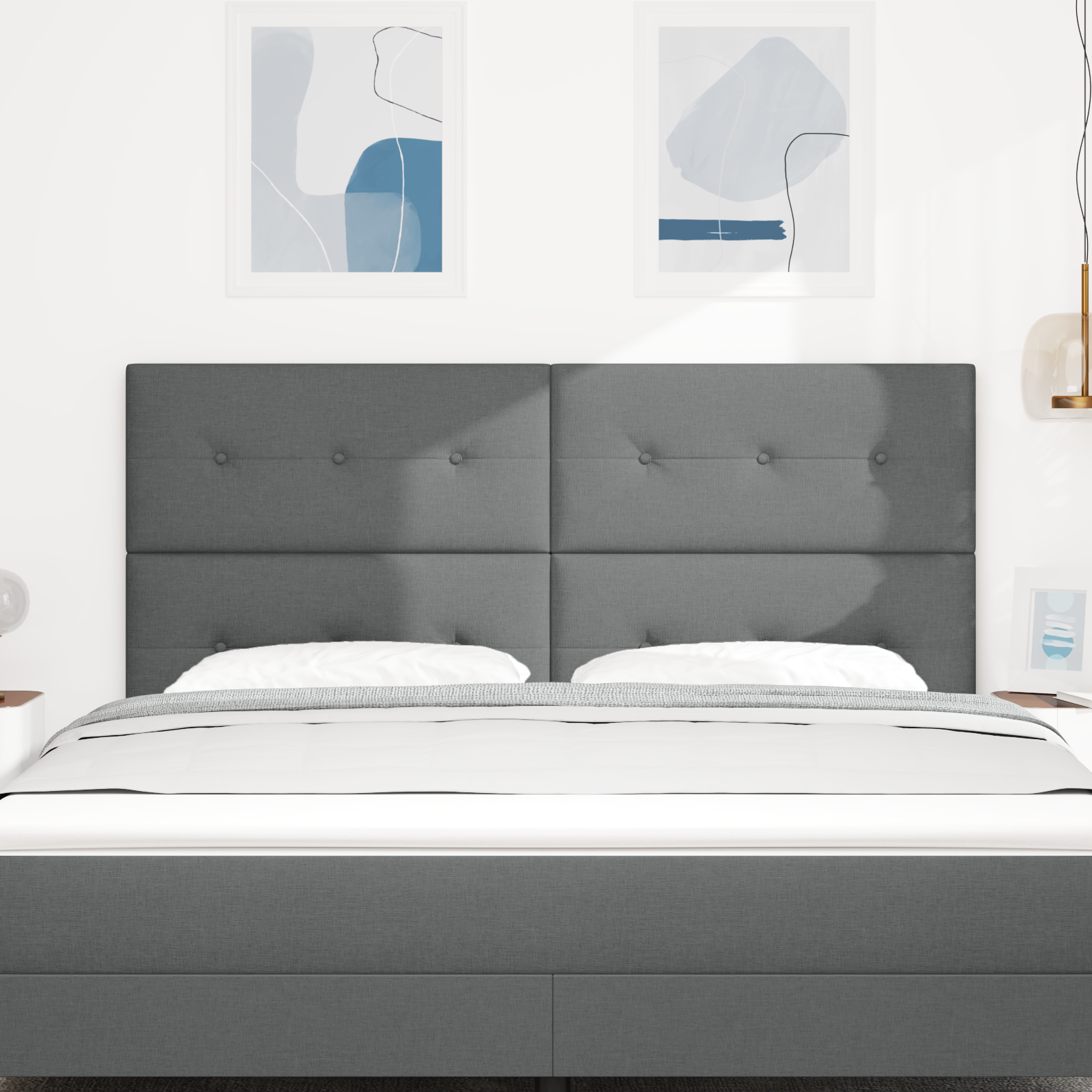 Den mørke grå farve er tidløs og sofistikeret, hvilket gør sengegavlen til et alsidigt valg, der harmonerer med forskellige farveskemaer og indretningsstile. Det bløde polyesterstof føles behageligt mod huden og inviterer til afslappende stunder med en god bog eller din yndlingsserie.