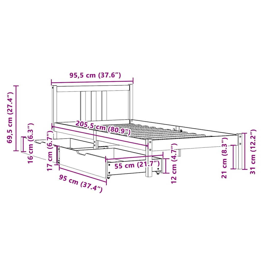 To rummelige sengeskuffer på hjul gør denne træseng til en smart opbevaringsløsning. De praktiske skuffer glider nemt ind og ud takket være de fire hjul og giver rigelig plads til ekstra sengetøj, dyner, puder eller sæsonbestemt tøj. Med indvendige mål på 86,5 x 52,5 x 10 cm per skuffe får du maksimal udnyttelse af pladsen under sengen.