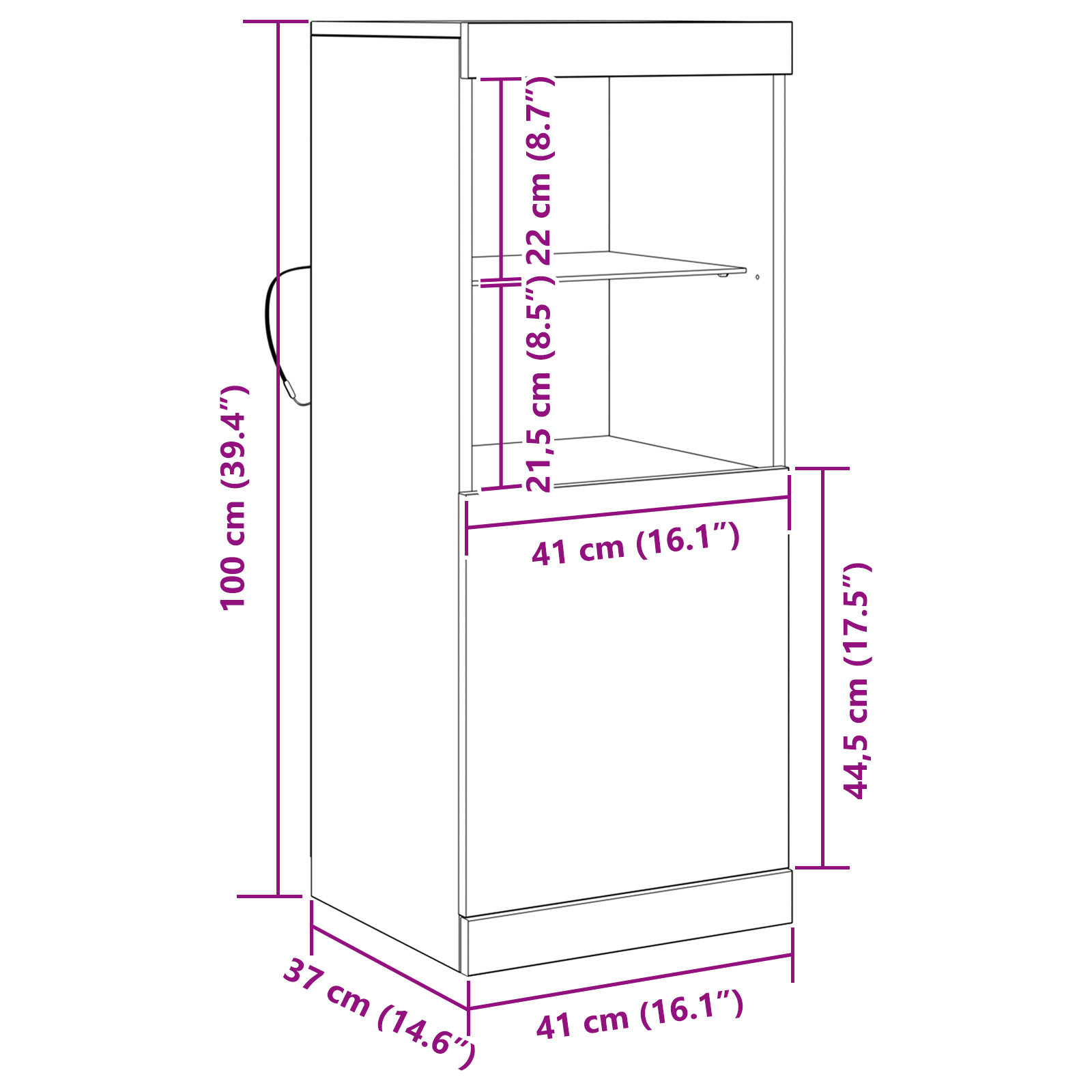 Konstruktionen i robust træmateriale sikrer lang holdbarhed og nem vedligeholdelse. Den kompakte størrelse på 41x37x100 cm gør det muligt at placere møblet selv i mindre rum, hvor det stadig vil fungere som et markant designelement. LED-belysningen tilføjer et ekstra lag af elegance og kan skabe den perfekte stemning til enhver lejlighed.