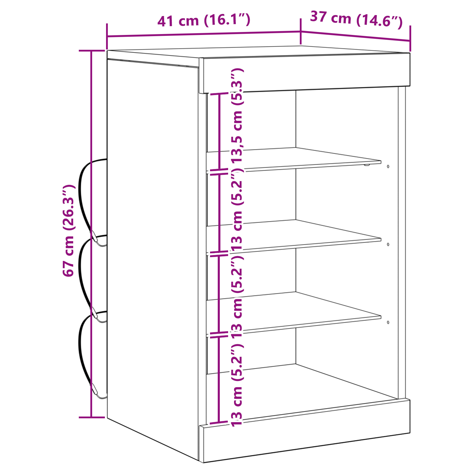 Dette moderne sideboard med LED lys i sort eg er den perfekte kombination af funktionalitet og stilfuldt design. Med sine kompakte mål på 41x37x67 cm passer det elegante møbel ind i både store og små rum, hvor det skaber en sofistikeret atmosfære med sit indbyggede LED belysning.