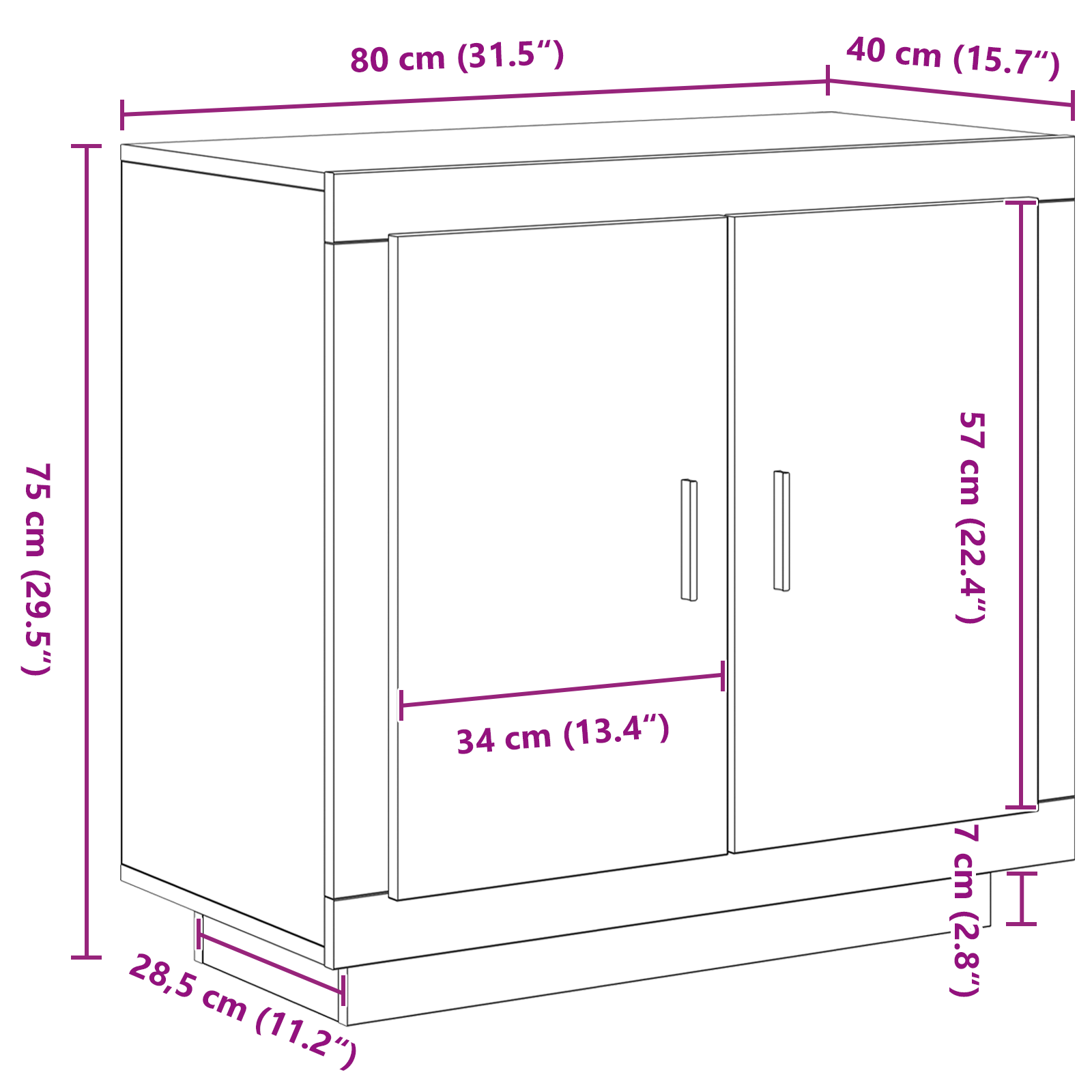 Med sine rene linjer og matte sorte finish i konstrueret træ, passer dette sideboard naturligt ind i både moderne, minimalistiske og skandinaviske indretninger. Den rektangulære form og de kompakte mål på 80x40x75 cm gør det til et alsidigt møbel, der kan placeres langs væggen uden at fylde for meget i rummet.