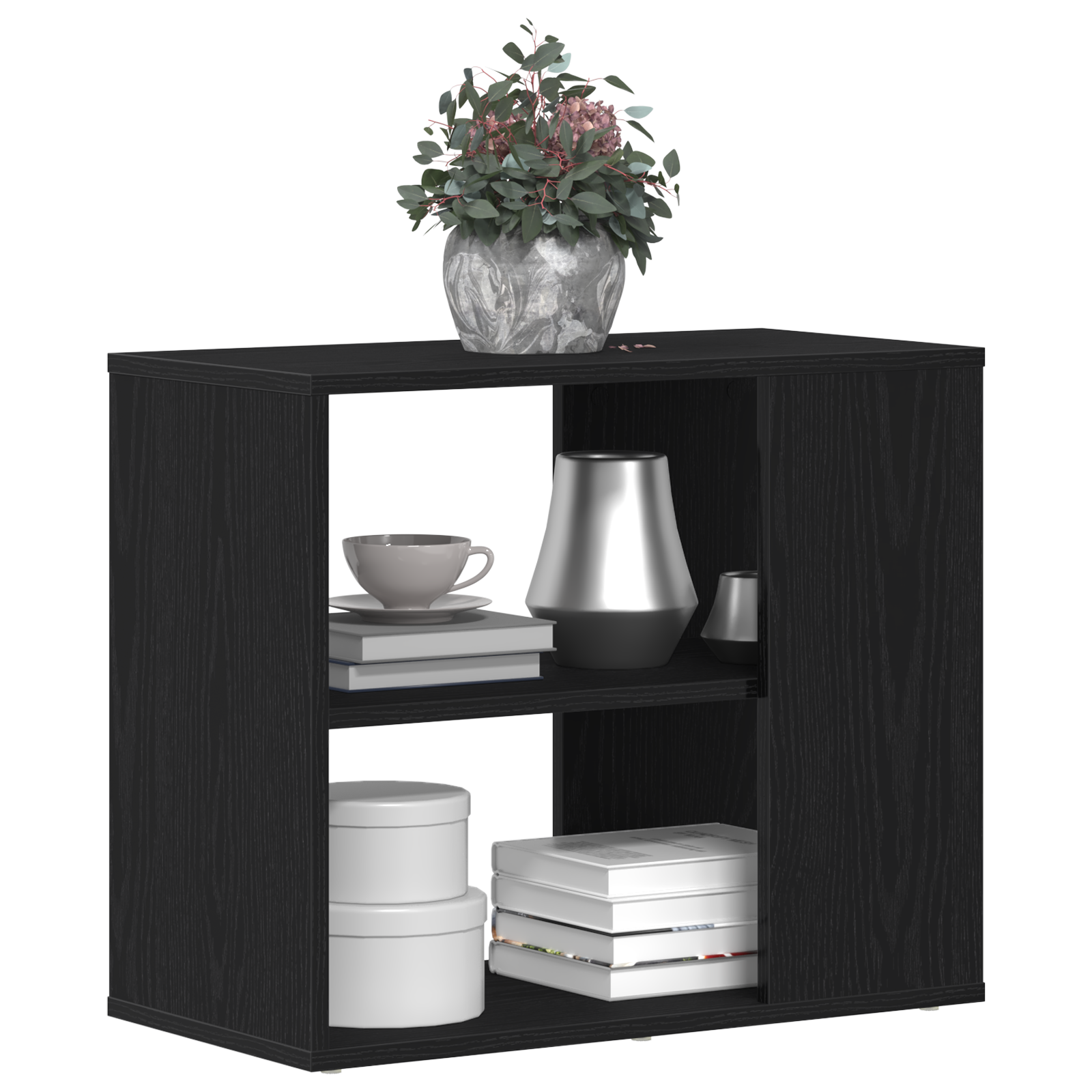 Skabet er fremstillet i højkvalitets konstrueret træ med en smuk sort eg finish, der tilføjer varme og karakter til dit hjem. Den rektangulære form og de kompakte mål på 60 x 30 x 50 cm gør det til en alsidig opbevaringsløsning, der kan placeres i stuen, spisestuen eller entreen uden at optage for meget plads.