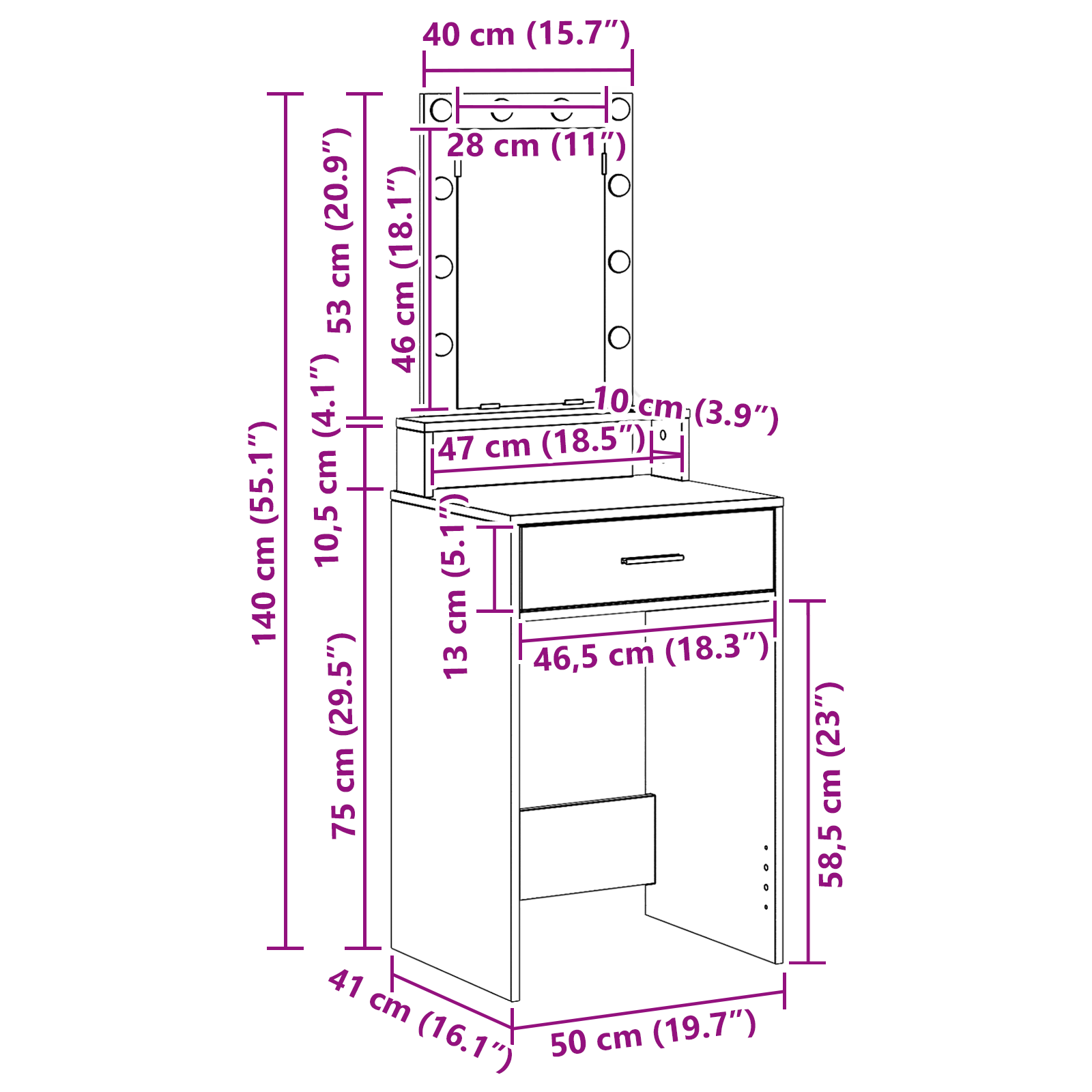 Med sine generøse dimensioner på 50x41x140 cm tilbyder dette makeup-bord med spejl og lys rigelig plads til at organisere hele din kosmetik-samling. De indbyggede LED-lamper rundt om spejlet sikrer optimal belysning under din daglige skønhedsrutine, så du altid kan se dig selv i det bedste lys.