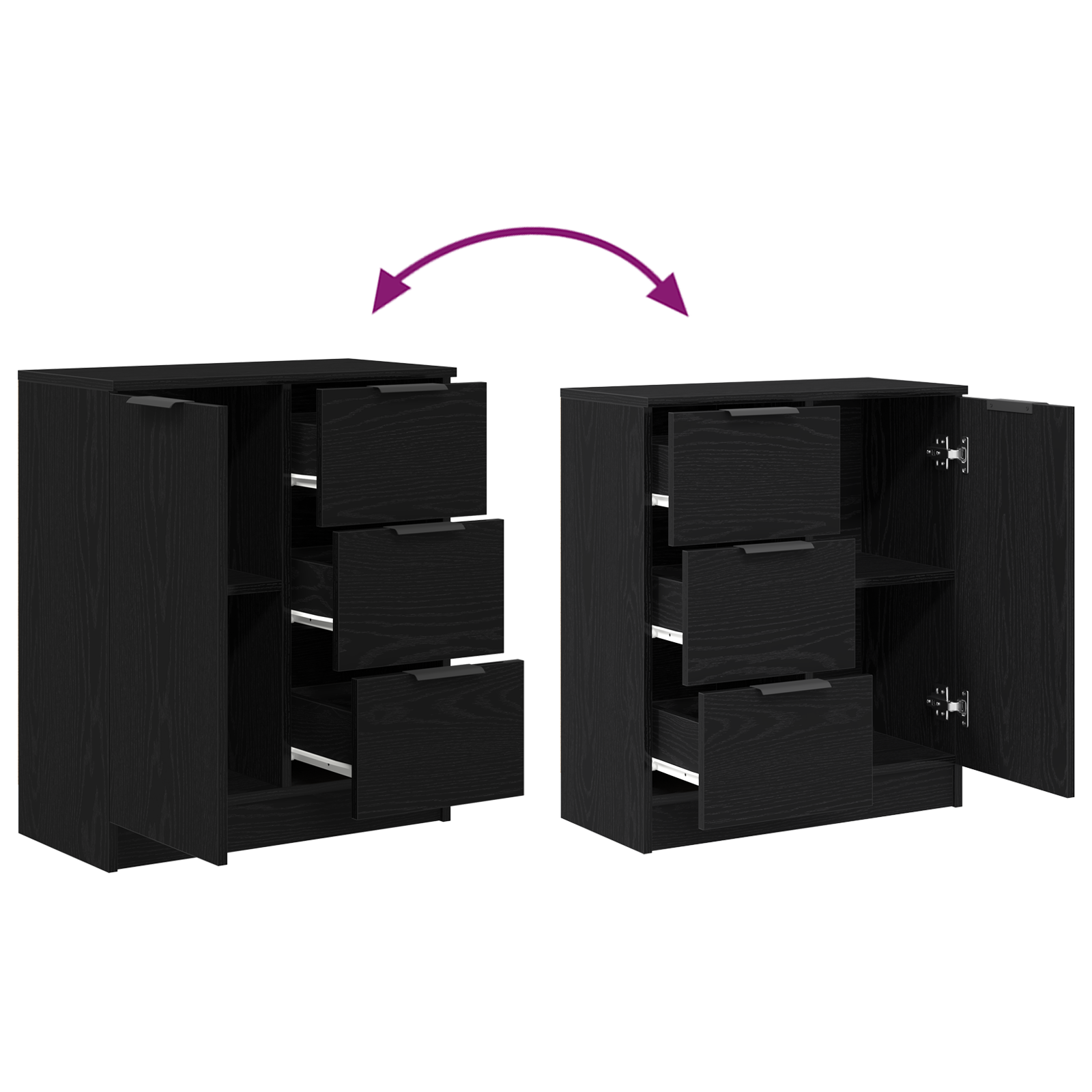 Dette sorte sideskab i egetræslook er den perfekte kombination af funktionalitet og æstetik. Uanset om du placerer det i spisestuen som opbevaringsmøbel til service og bestik, eller bruger det i stuen til at organisere bøger og dekorationer, vil dette møbel tilføje både stil og praktisk værdi til dit hjem.