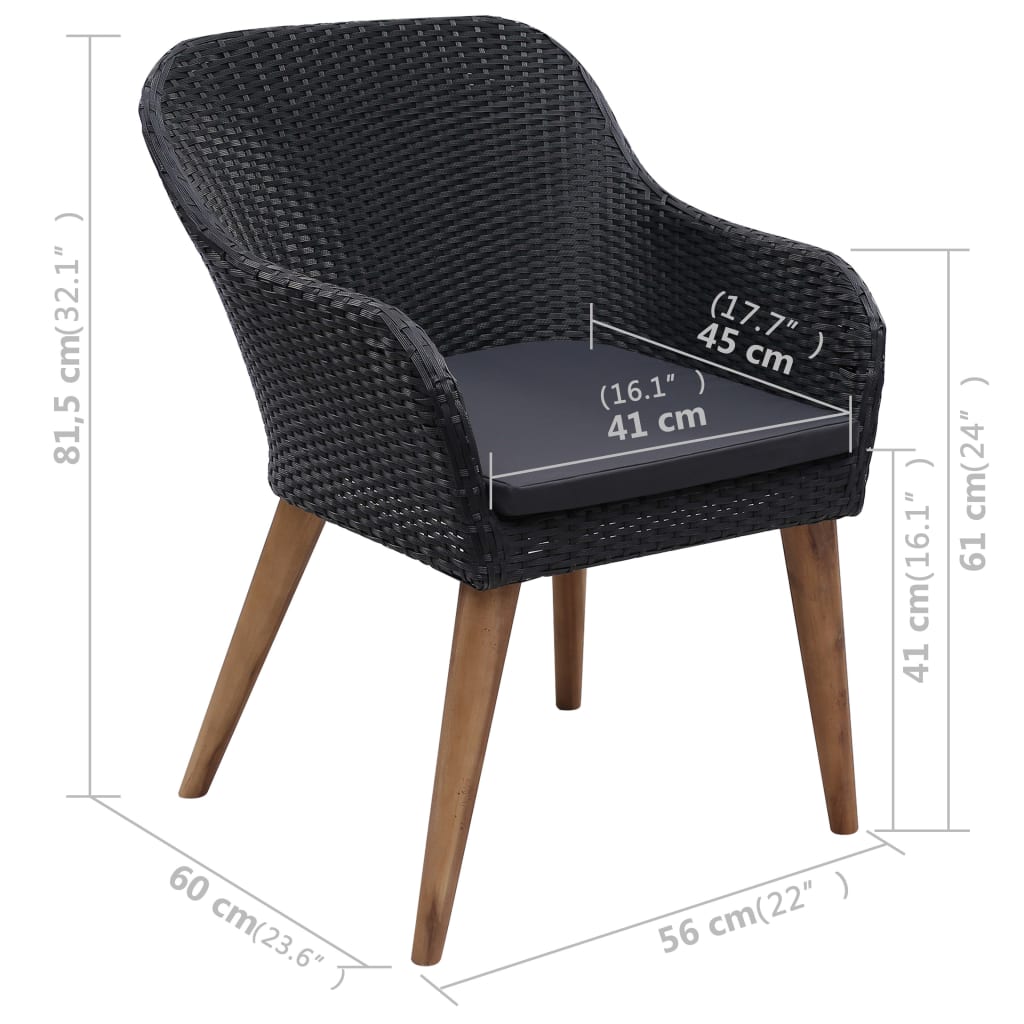 Materiale stole: Polyrattan (polyethylen), pulverlakeret stål og massivt akacietræ