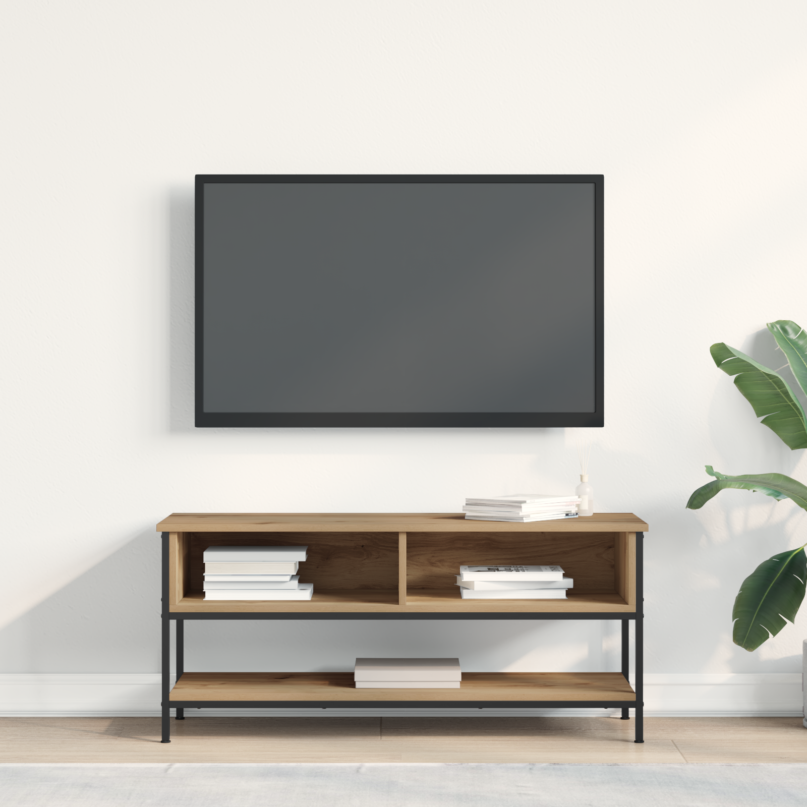 TV-bordet er fremstillet i en smuk kombination af konstrueret træ med artisan eg-finish og en robust stålramme i mat sort. Den varme træstruktur skaber en indbydende atmosfære, mens de rene linjer og den minimalistiske konstruktion passer perfekt ind i moderne hjem. Med sine kompakte mål på 100 x 35 x 45 cm er dette tv-bord ideelt til både små og mellemstore stuer.