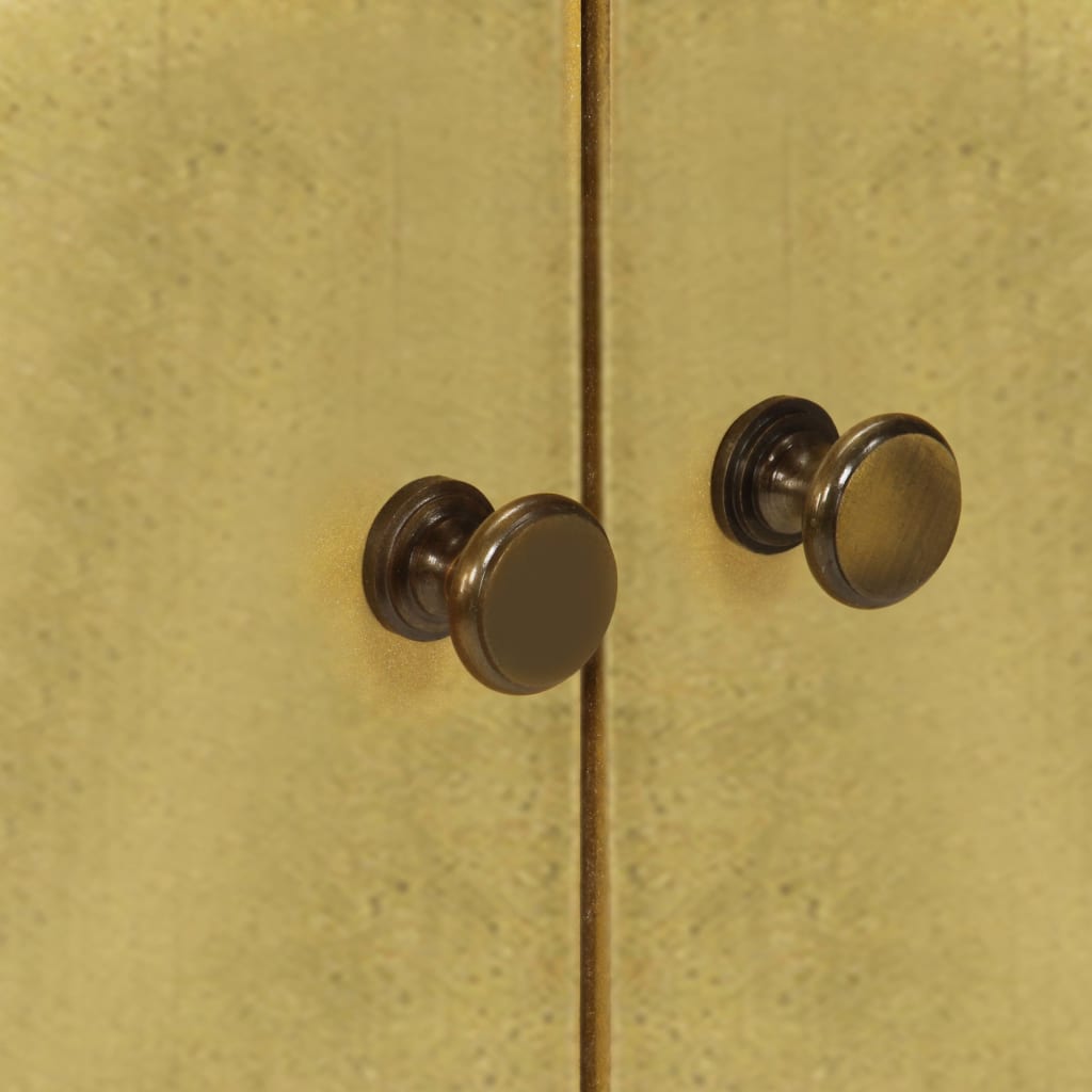 Dette elegante tv-skab i massivt mangotræ kombinerer tidløst design med praktisk funktionalitet. Med sine karakteristiske retro-linjer og det dekorative gyldne print på fronten, tilføjer tv-møblet et sofistikeret udtryk til din stue eller medierum.