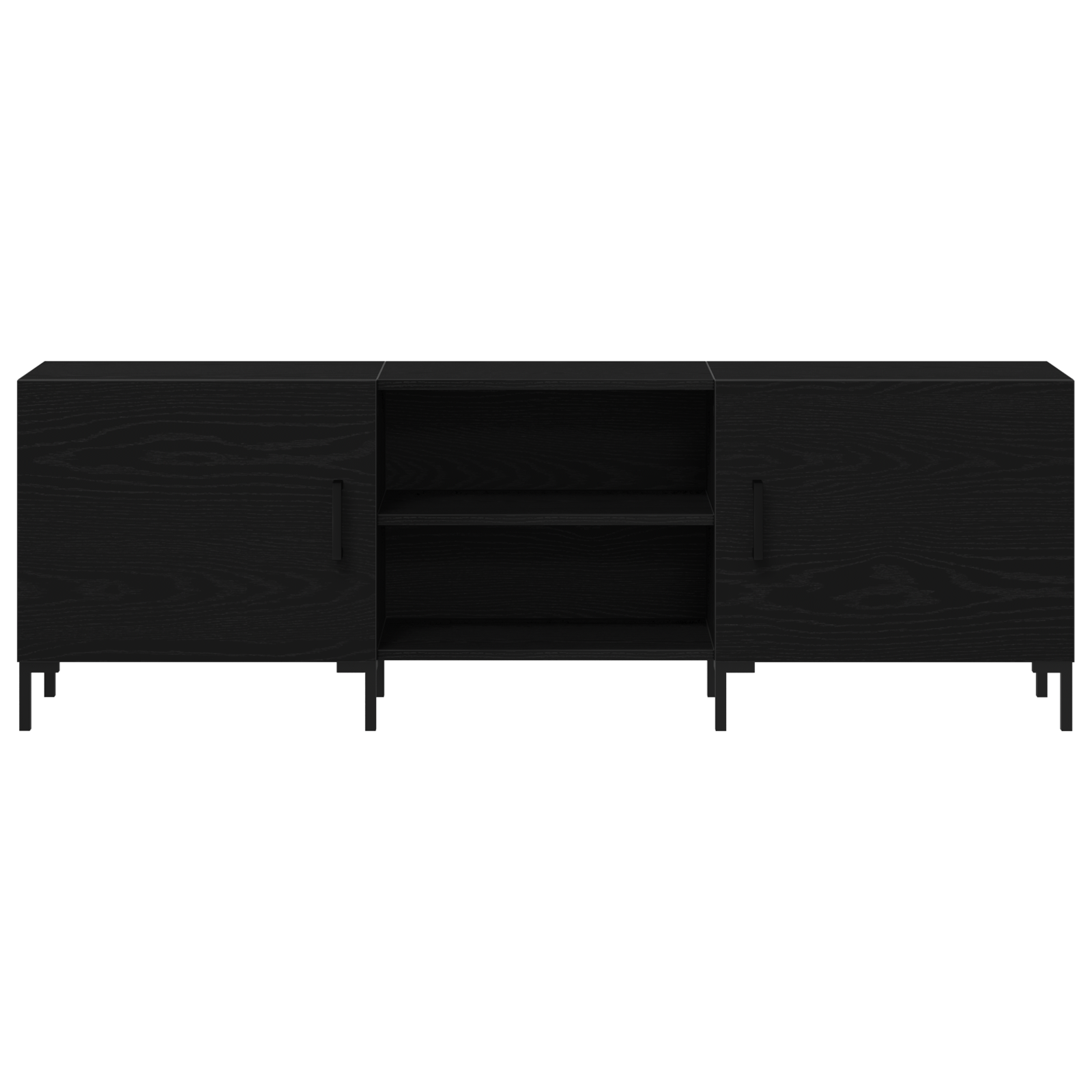To praktiske svævehylder giver ekstra displaymuligheder for dine yndlingsgenstande, familiefotos eller dekorative elementer, mens de to døre med elegante matte sorte håndtag skjuler rod og skaber et rent, minimalistisk look. Bag dørene finder du rummelige opbevaringsrum til spillekonsoller, DVD-afspillere, kabler og andre medierelaterede genstande.