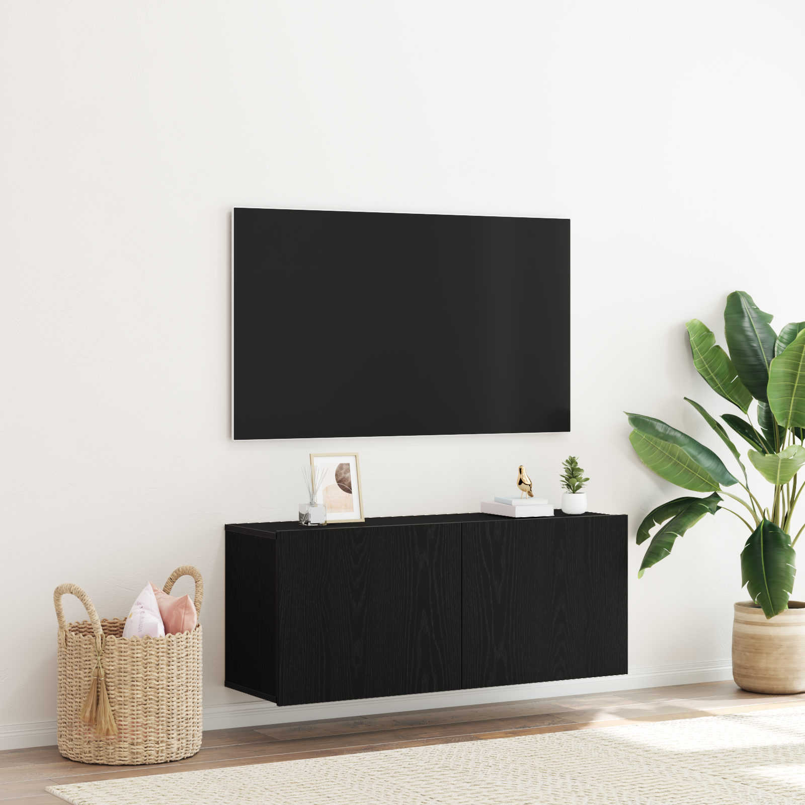 Med sine rene linjer og matte finish i sort eg tilføjer dette væghængte tv-skab et sofistikeret udtryk til ethvert rum. Den neutrale farve gør det nemt at integrere tv-vægmøblet i din eksisterende indretning, uanset om du foretrækker en minimalistisk, moderne eller klassisk stil.