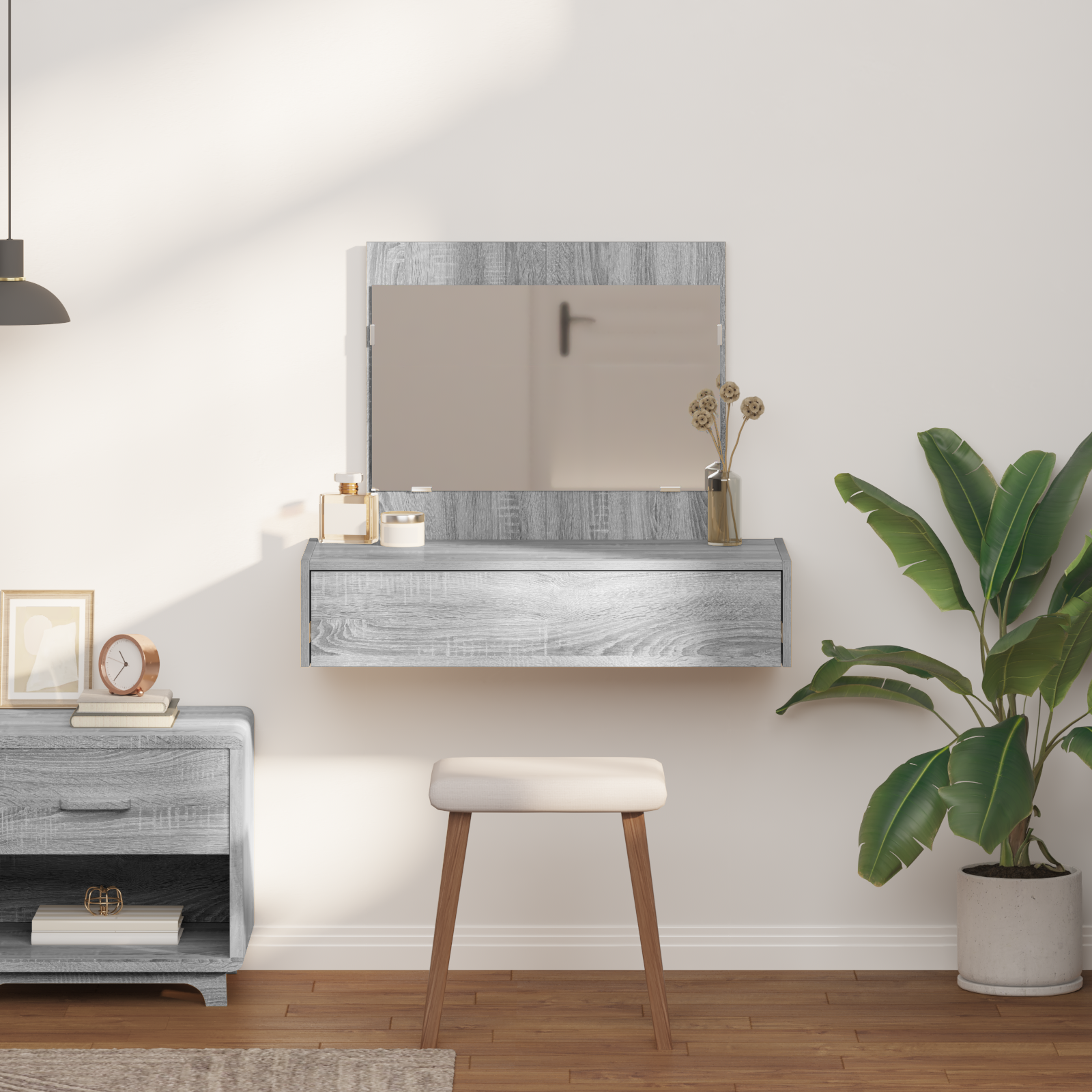 Dette elegante vægmonterede makeupbord i grå sonoma finish kombinerer moderne design med praktisk funktionalitet. Makeupbordet er den perfekte løsning til soveværelset, hvor du ønsker at skabe et dedikeret område til daglig pleje og styling uden at optage værdifuld gulvplads.
